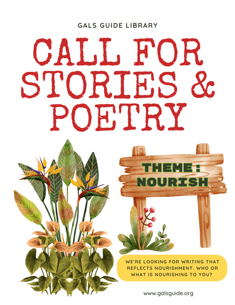 Gal’s Guide seeks prose or poetry about nourishment. Does a certain food nourish you? What else is necessary for your growth? What helps sustain your health? What fosters a positive state of mind? What is a feeling or belief that you have cultivated that kept you going? Who or what is nourishing to you?
