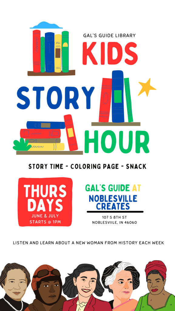 Come to the Gal’s Guide Library for a kid’s story time that includes a coloring page and a snack. Learn about a new woman from history each week.